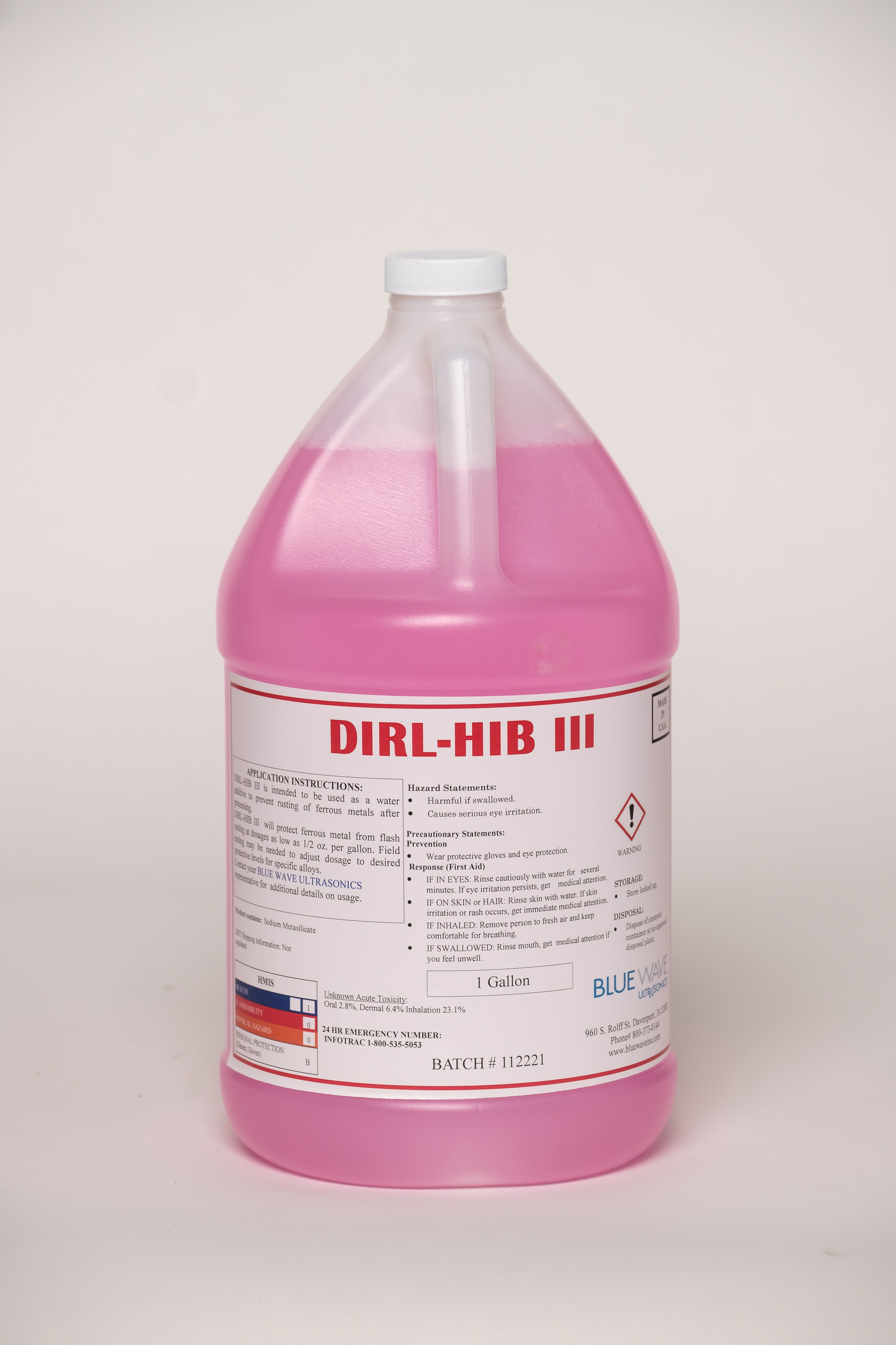 Dirl-Hib III is intended to be used as a water additive to prevent rusting of ferrous metals after processing.  Dirl-Hib III rust inhibitor will protect ferrous metals from flash rusting at dosages as low as 1/2 ounce per gallon of water.  Field testing may be needed to adjust the dosage to desired protective levels for specific alloys.